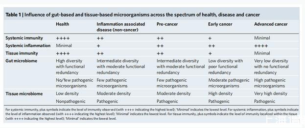 腸道內(nèi)的微生物可以塑造全身免疫并影響全身水平的健康和疾病(包括癌癥)狀態(tài)。從健康到炎癥到早癌再到癌癥,全身和局部免疫及炎癥狀況、腸道微生物組以及組織中微生物的狀況都有巨大差異。