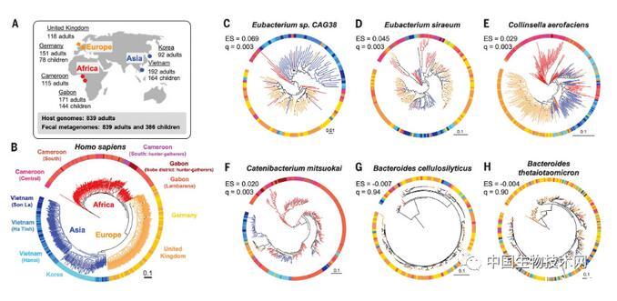 先前的研究表明,腸道細(xì)菌譜系的一小部分與原始人類祖先一起形成了物種,但這種共同多樣化模式是否在人類宿主中擴(kuò)展還有待證實(shí)。自從人類走出非洲后,人口在全球范圍內(nèi)不斷增長(zhǎng)。飲食和生活方式也隨著時(shí)間推移發(fā)生了巨大的變化。然而,特定的腸道細(xì)菌菌種不但沒有消失,而且已經(jīng)與人類“同呼吸,共命運(yùn)”。因此,識(shí)別與人類共存的菌種對(duì)于理解腸道細(xì)菌如何隨著其人類宿主的共同進(jìn)化,以及兩者之間的相互作用具有重要意義。 在這項(xiàng)新研究中,該團(tuán)隊(duì)首次系統(tǒng)地比較了人類與其腸道微生物的進(jìn)化史。他們?yōu)閬碜约优睢⒃侥虾偷聡?225名母子參與者(839名母親和386名兒童)及其腸道中發(fā)現(xiàn)的59個(gè)微生物分類群創(chuàng)建了系統(tǒng)發(fā)育樹,以評(píng)估人類種群之間和種群內(nèi)共享的腸道細(xì)菌菌種之間的共同多樣化,并使用統(tǒng)計(jì)測(cè)試來調(diào)查這些發(fā)育樹的匹配程度。