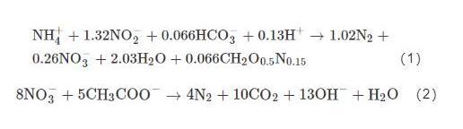 但也有另外一些學(xué)者認(rèn)為,NH4+-N不能被直接轉(zhuǎn)化。因此,關(guān)于NH4+-N能否成為BES系統(tǒng)的電子供體尚無定論。此外,另外一種陽極氨氧化的途徑是厭氧氨氧化,其以NH4+-N和NO2--N為底物,將氮素轉(zhuǎn)化為氮?dú)猓朔N方法被認(rèn)為是陽極氨氧化的主要途徑(式1)。陽極異養(yǎng)反硝化脫氮?jiǎng)t以傳統(tǒng)的生物反硝化為基本原理,將NO3--N還原為N2(式2),其適用于高碳氮比廢水的脫氮處理。