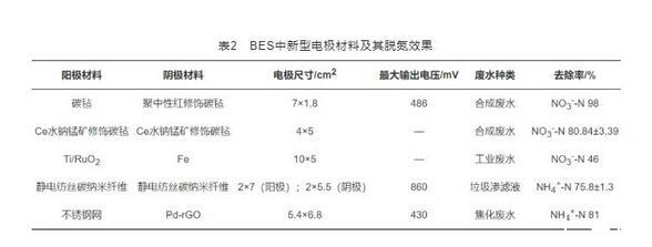 電極材料是BES的重要組成部件。電極材料在BES中可直接用作電子供體或受體,不僅會影響微生物的吸附量,也會影響微生物與電極間的電子傳遞效率。選取電極材料時(shí),應(yīng)對材料的導(dǎo)電性能、吸附性能、生物相容性等進(jìn)行考察。近年來新型電極材料在BES脫氮中的應(yīng)用情況見表2。