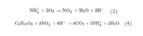 BES系統(tǒng)的陰極接收從陽極傳來的電子,并將電子傳遞至陰極室的電子受體中。陰極室內(nèi)的脫氮途徑主要包括硝化、異養(yǎng)反硝化、自養(yǎng)反硝化、厭氧氨氧化以及異化硝酸鹽還原為銨這5種途徑。陰極室內(nèi)的硝化、異養(yǎng)反硝化及厭氧氨氧化途徑主要是通過調(diào)整陰極室的DO來實(shí)現(xiàn),硝化途徑如式(3)所示。