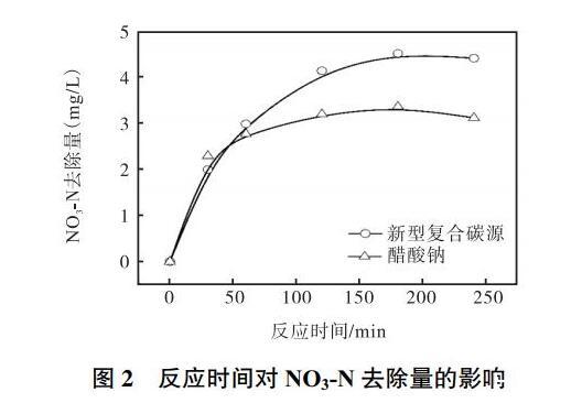 由圖2可知,對于醋酸鈉碳源和新型復合碳源,隨著反應時間的延長,在反應時間3h前,NO3-N的去除量均隨反硝化時間的增加逐漸增大,在反應時間介于3~4h之間時,硝態氮去除量變化不大。因此,確定反應時間為3h。