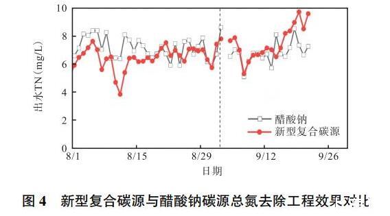 由圖4可知,在A階段下,用新型復合碳源作為外加碳源時,二沉池出水總氮濃度值大部分低于乙酸鈉碳源的情形,這表明新型復合碳源投加量仍有下調空間。在試驗B階段下,經統計分析,新型復合碳源作為碳源時的二沉池出水總氮小于醋酸鈉碳源時的天數為5d,僅占比為23.8%,由此推斷在獲得等量硝酸鹽去除下,新型復合碳源的節省量最好控制在50%之內。