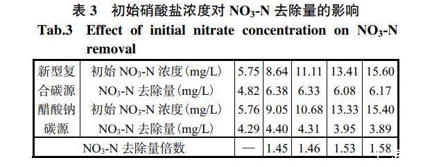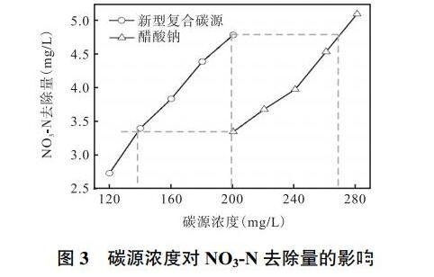 由圖3可知,對新型復合碳源和醋酸鈉碳源,NO3-N去除量均隨著碳源濃度的增加呈線性增加。在200mg/L新型復合碳源下的NO3-N去除量為4.79mg/L,而在獲得等量的NO3-N的去除量下,所需醋酸鈉濃度為270mg/L;同理在200mg/L醋酸鈉濃度下NO3-N的去除量為3.34mg/L,而在獲得相同NO3-N去除量前提下,所需的新型復合碳源濃度僅為140mg/L。由圖3可獲得在相同NO3-N去除量下,其他新型復合碳源濃度與醋酸鈉濃度的對應關系,見表2。從該表中可知,在獲得等量的NO3-N去除量下,相比醋酸鈉碳源,新型復合碳源可節省30%用量。