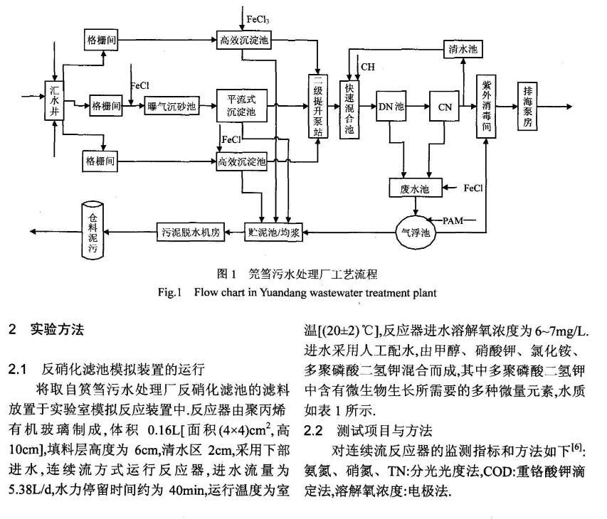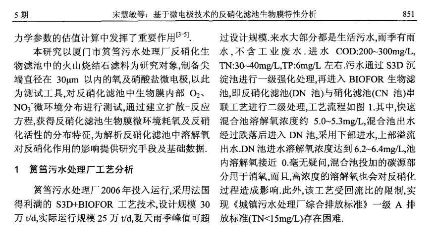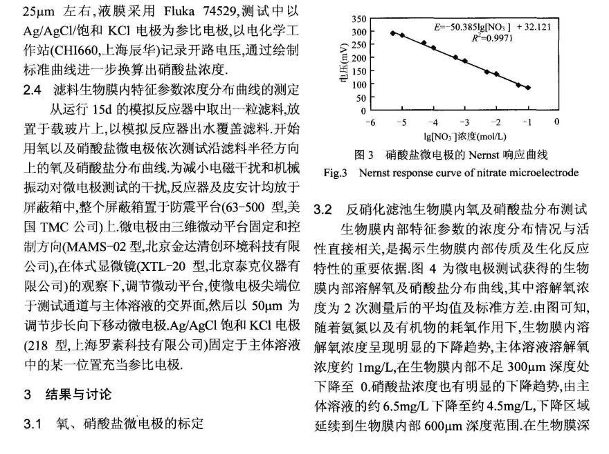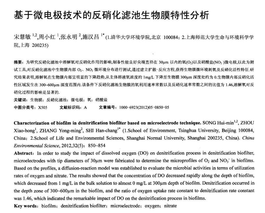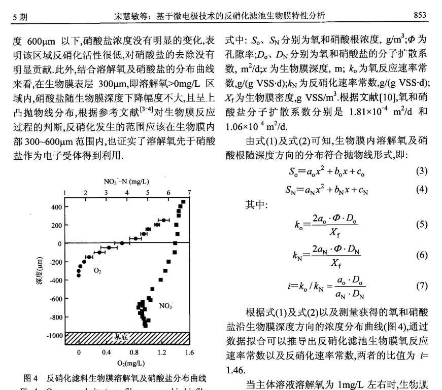 為研究反硝化濾池中溶解氧對反硝化作用的影響,制備性能良好尖端直徑在30μm以內(nèi)的氧(O2)以及硝酸鹽(NO3-)微電極,以此為測試工具,對反硝化濾池中生物膜內(nèi)部O2、NO3-微環(huán)境分布進(jìn)行測試,通過建立擴(kuò)散-反應(yīng)方程,獲得生物膜微環(huán)境耗氧及反硝化活性特征。研究結(jié)果表明,溶解氧在生物膜內(nèi)部呈明顯的下降趨勢,從主體溶液氧濃度約1mg/L下降至生物膜300μm深度處約為0.生物膜內(nèi)部反硝化活性區(qū)域發(fā)生在300~600μm深度范圍內(nèi)。該條件下反硝化濾池生物膜的氧利用速率常數(shù)以及反硝化速率常數(shù)之間的比值為1.46,溶解氧對反硝化過程的影響是顯著的。