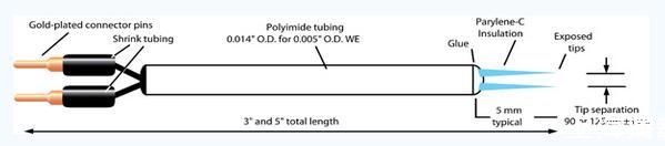 這些電極在屏蔽式電信號(hào)記錄和激發(fā)電位應(yīng)用方面是非常出色的,尤其適合于雙極刺激。該電極尖端是由鎢絲制成,直徑為75微米。外層不銹鋼導(dǎo)體管用0.2毫米厚度的多聚亞胺絕緣材料包裹直到不銹鋼管的末端,也可以提供沒有絕緣材料包裹的這類電極。