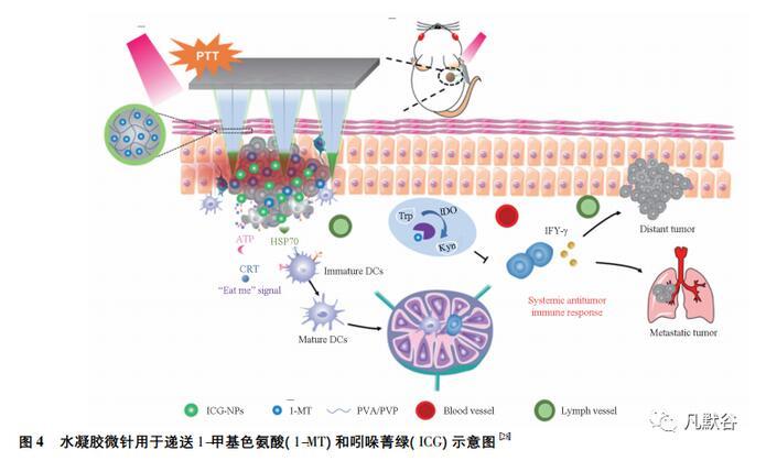 表皮和真皮中富含抗原呈遞細胞(APCs)和朗格漢斯細胞,皮膚組織中的天然免疫微環境能與運送的藥物協同發揮治療效果。水凝膠微針作為抗程序性死亡受體(PD1)抗體與其他檢查點抑制劑的載體,可用于黑色素瘤免疫治療。Chen等[28]構建一種核-殼結構微針(CS-MNs)陣列,見圖4,以可降解的聚乙烯吡咯烷酮(PVP)和聚乙烯醇(PVA)交聯形成的凝膠為核心,負載1-甲基色氨酸(1-MT)采用吲哚菁綠(ICG)納米顆粒沉積在微針殼上的方法制備了CS-MNs。微針插入腫瘤部位后,吸收組織液溶解,隨后釋放ICG-NPs和1-MT,經近紅外照射后,ICG-NPs有效地將近紅外光能轉化為熱消融原發腫瘤,生成腫瘤相關抗原和損傷相關分子模式(DAMPs),促進了樹突狀細胞的成熟和免疫刺激性細胞因子的分泌。釋放出的1-MT逆轉了吲哚胺2,3-雙加氧酶介導的免疫抑制,最終引起有效的系統免疫應答。體內結果顯示,80%的黑色素瘤被根除,最后在超過120 d內無復發存活。微針作為免疫原性細胞死亡(ICD)誘導劑和免疫治療劑的載體具有獨特的優勢:①通過將載藥針尖嵌入淺表腫瘤大大提高了ICD誘導劑在損傷部位的積累;②通過設計良好的陣列結構,提供空間可控的藥物分布和滲透;③豐富的免疫增強劑有助于提呈抗原,增強了免疫應答。