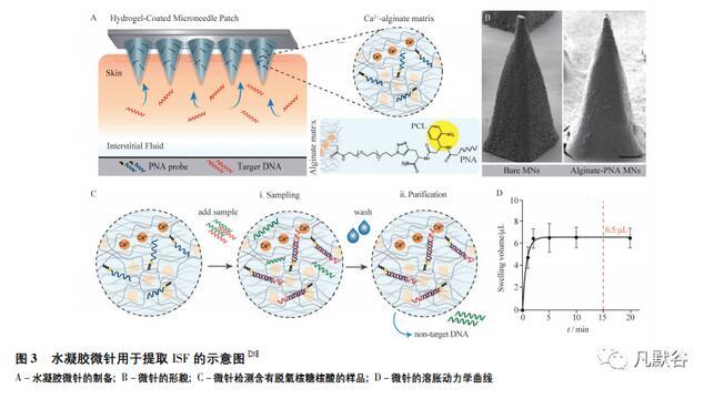 皮膚間質液(interstitial fluid,ISF)存在皮膚層,屬于人體的一種體液,含有與臨床分析有關的一系列生物標志物。近年來,微針從皮膚中提取ISF在微創診斷和生物傳感器方面受到越來越多的關注。微創技術是早期診斷癌癥、糖尿病、皮膚病等多種疾病的有效方法,主要通過從液體活檢中取樣,減少血液污染的風險,檢測無細胞核酸生物標記物。水凝膠微針要求材料具有優異的溶脹能力,以一種無痛和微創方式提取皮膚間質液,檢測特定的生物標志物。現有的水凝膠微針以微創方式提取ISF需要十多分鐘才能收集足夠的體積進行臨床分析。為縮減取樣時間,很多學者致力于研究新型水凝膠微針。Dana Al Sulaiman等[20]設計了一種海藻酸鈉-肽核酸雜交材料的微針,見圖3,在2 min內取樣6.50μL液體,分離和檢測皮膚間質液中核酸生物標記物的特異性序列,同時使捕獲的miRNA能夠被原位檢測。克服了以往微針低采樣容量(小于2μL)和長采樣時間(大于1 h)的缺點。Zheng等[24]介紹了一種滲透壓驅動的水凝膠微針,由滲透質(麥芽糖)和水凝膠(甲基丙烯酸)組成。在提取過程中,滲透壓細胞溶解在基質中,并提供滲透壓,增加ISF從皮膚到水凝膠基質的擴散。結果顯示,3 min內從離體豬皮中提取7.90μL ISF,從活體小鼠皮中提取3.82μLISF,而對照組(即不含滲透壓細胞的水凝膠微針頭)需要10min以上才能達到類似的效果。提取出的ISF可以定量生物標記物,如葡萄糖和萬古霉素[25],同時釋放一定量的治療藥物,如胰島素。通過與電子葡萄糖傳感器的集成,整個系統可以直接、快速地分析提取葡萄糖。這種檢測方式便于檢測患者體內的靶分子,為糖尿病患者的治療提供理論依據。Chen等[23]制備了一種無電子、無酶、無納米顆粒的智能人造皮膚胰腺———微針貼片,由葡萄糖敏感的硼酸鹽水凝膠和生物相容性絲素半穿透網絡構成,模擬胰腺功能,在水環境下至少穩定2個月,以一種安全、經濟有效、便利的方式實現了按需胰島素給藥,給予患者急性和持續的血糖控制。不同于Chen的設計,He等[21]研制了一種聚乙烯醇(PVA)和殼聚糖(CS)水凝膠微針,用于護理點測試(POCT)。PVA/CS水凝膠微針干燥后機械強度增強,有利于穿刺皮膚,并且水凝膠具有多孔微觀結構,為提取ISF提供了良好的溶解度,PVA的熱降解性能有助于提高取樣速率,最后在1 d內檢測兔皮膚中葡萄糖水平,為基于皮膚的POCT提供了一個更大的發展平臺。