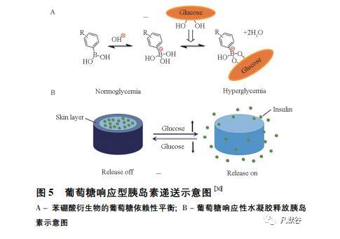 分子間電荷的相互作用大小會直接影響藥物的釋放速度。Yu等[12]以乙二醇二甲基丙烯酸酯(EGDMA)、3-(丙烯酰胺基)苯硼酸(3APBA)、(二甲氨基)丙烯酸乙酯(DMAEA)為單體,通過原位光聚合方法與胰島素混合制備得葡萄糖響應性微針(GR-MN),當GR-MN暴露于高血糖條件下時,PBA與葡萄糖發生可逆反應,生成環硼酸酯,增加聚合物基質中的負電荷,增強微針的膨脹,引發微針裝載的胰島素快速擴散到皮膚組織中。同時,負電荷密度的增加也減弱了帶正電荷DMAEA分子與帶負電荷胰島素分子之間的靜電相互作用,進一步促進了胰島素的釋放。同一課題組的Wang等[13]也充分利用了聚合物與胰島素分子之間的靜電相互作用調整正電荷組與PBA的比值,使復合物在正常血糖條件下抑制胰島素釋放,在高血糖條件下促進胰島素釋放。靜電交聯方式制備的水凝膠最大優勢在于達到對藥物的可控釋放,但載藥量較少,需要持續釋藥方可達到可觀的治療效果,還有可能給患者帶來疼痛感。