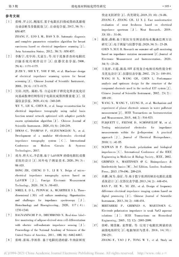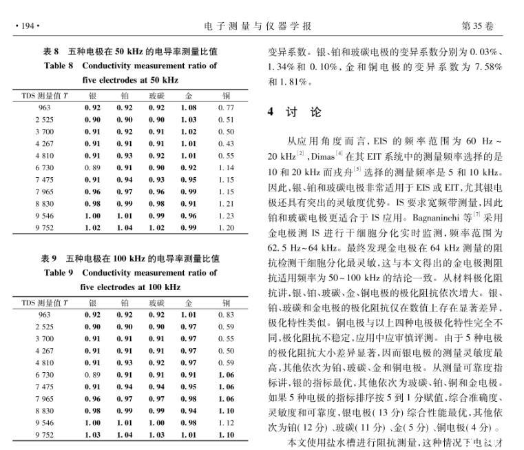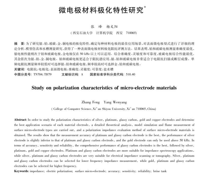 為了研究銀、鉑、玻碳、金、銅電極的極化特性,確定每種材料電極的最佳應用場景,對表面微電極型式進行了詳細的理論分析、模型仿真和水槽測量研究,獲得了一種表面微電極材料極化阻抗評測方法。結果表明,鉑和玻碳電極測量準確度最優,銀電極性能稍次于鉑和玻碳電極,金電極僅在50 kHz以上可以適用。綜合準確度、靈敏度和可靠度,玻碳電極綜合性能最優,其余依次為銀、鉑、金、銅電極。鉑和玻碳電極更適合于阻抗譜應用,銀、鉑和玻碳電極非常適合于電阻抗掃描或斷層成像。單頻電阻抗測量頻率較低時可選擇銀、鉑和玻碳電極,頻率較高時可選擇金、鉑和玻碳電極。