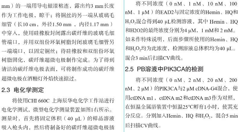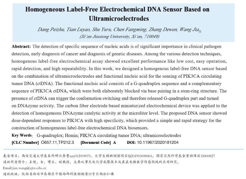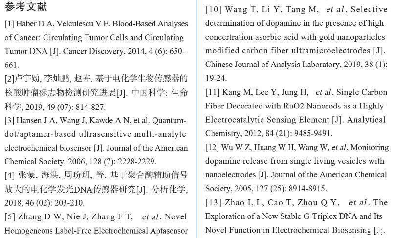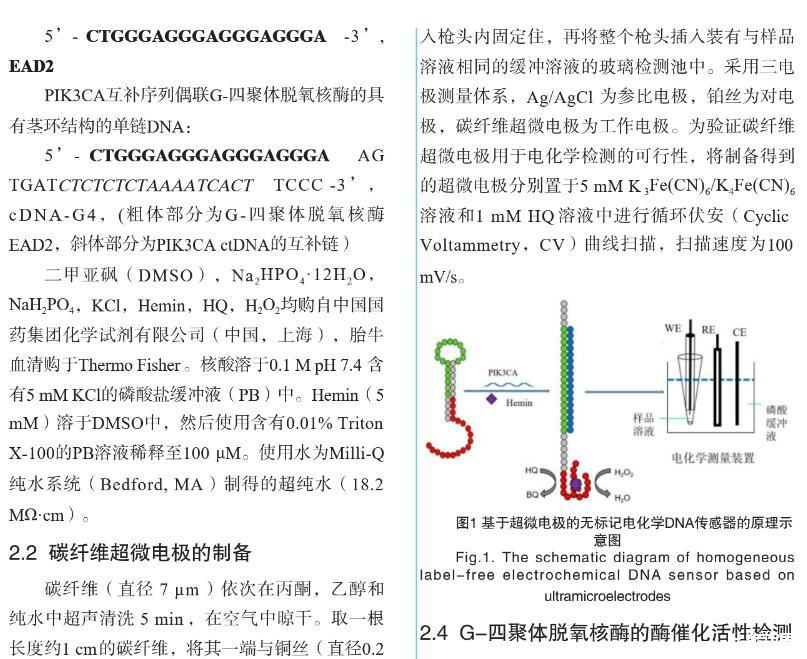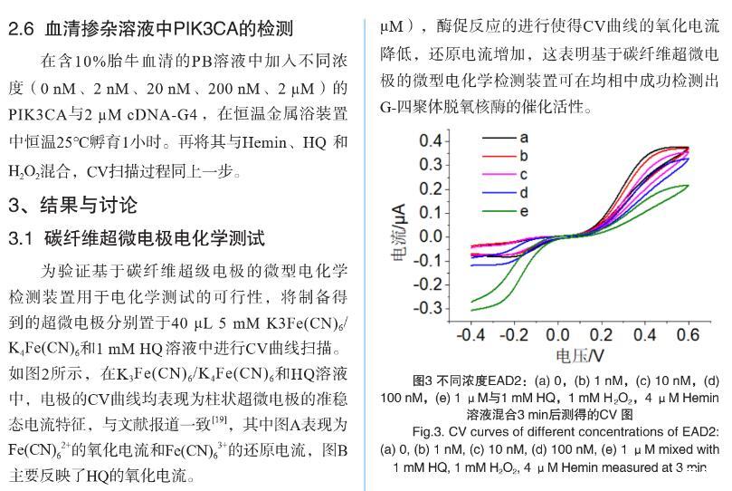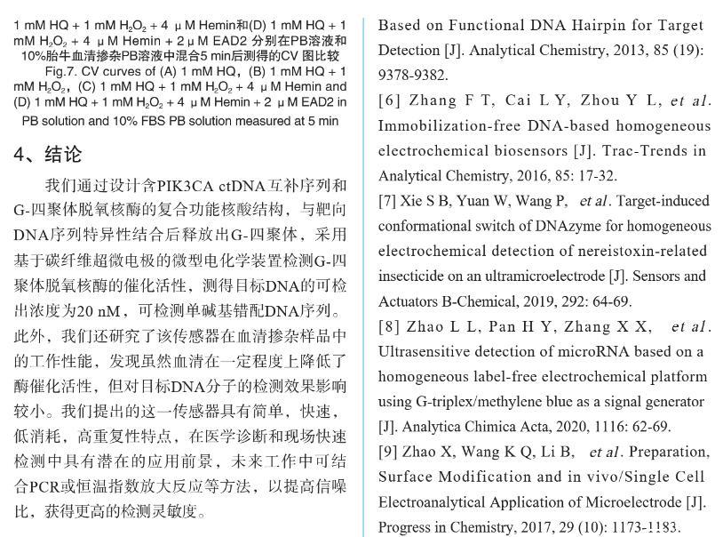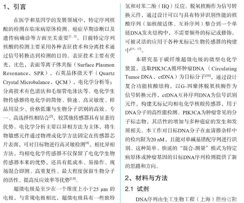 【摘要】:特定序列核酸的檢測在臨床病原體檢測、癌癥早期診斷以及遺傳病確診等方面至關重要。無標記均相電化學傳感器在低消耗、低成本、易操作、快速檢測和高重復性等方面具有顯著的優勢。我們基于復合功能核酸分子和超微電極檢測裝置,構建了無標記均相電化學核酸傳感器,用于PIK3CA循環腫瘤DNA(ctDNA)的高特異性檢測。將PIK3CA ctDNA互補序列和G-四聚體脫氧核酶偶聯,分別作為目標識別元件和信號轉換元件,設計了具有莖環結構的單鏈DNA,其中G-四聚體和ctDNA互補序列通過堿基互補被封閉。當目標DNA即PIK3CA與其互補序列特異性結合后會導致DNA構象變化,釋放G-四聚體并發揮過氧化物酶的活性,催化H2O2和對苯二酚(HQ)反應,產生對苯醌(BQ)和水。使用碳纖維超微電極微型電化學裝置對微升體積樣本中HQ和BQ的氧化還原電流信號進行檢測。結果表明:氧化還原電流信號隨目標DNA分子濃度變化而變化,檢測限達20 nM,可有效區分完全互補序列和單堿基錯配序列DNA。此外,在血清摻雜樣本中該傳感器表現出類似的檢測效果。本研究設計的電化學生物傳感器實現了微升體積內ctDNA的高性能檢測,為特定病原體或腫瘤基因的靶向DNA序列檢測提供了一種新思路,在醫學診斷和便攜式檢測中具有廣闊的應用前景。