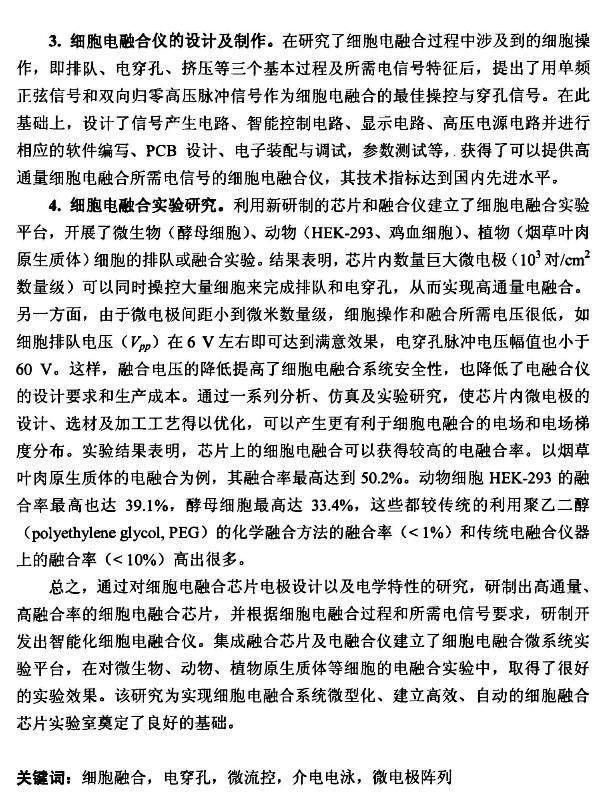 4.細胞電融合實驗研究。利用新研制的芯片和融合儀建立了細胞電融合實驗平臺,開展了微生物(酵母細胞)、動物(HEK-293、雞血細胞)、植物(煙草葉肉原生質體)細胞的排隊或融合實驗。結果表明,芯片內數量巨大微電極(103對/cm2數量級)可以同時操控大量細胞來完成排隊和電穿孔,從而實現高通量電融合。另一方面,由于微電極間距小到微米數量級,細胞操作和融合所需電壓很低,如細胞排隊電壓(Vpp)在6 V左右即可達到滿意效果,電穿孔脈沖電壓幅值也小于60 V。這樣,融合電壓的降低提高了細胞電融合系統安全性,也降低了電融合儀的設計要求和生產成本。通過一系列分析、仿真及實驗研究,使芯片內微電極的設計、選材及加工工藝得以優化,可以產生更有利于細胞電融合的電場和電場梯度分布。實驗結果表明,芯片上的細胞電融合可以獲得較高的電融合率。以煙草葉肉原生質體的電融合為例,其融合率最高達到50.2%。動物細胞HEK-293的融合率最高也達39.1%,酵母細胞最高達33.4%,這些都較傳統的利用聚乙二醇(polyethylene glycol,PEG)的化學融合方法的融合率(1%)和傳統電融合儀器上的融合率(10%)高出很多。總之,通過對細胞電融合芯片電極設計以及電學特性的研究,研制出高通量、高融合率的細胞電融合芯片,并根據細胞電融合過程和所需電信號要求,研制開發出智能化細胞電融合儀。集成融合芯片及電融合儀建立了細胞電融合微系統實驗平臺,在對微生物、動物、植物原生質體等細胞的電融合實驗中,取得了很好的實驗效果。該研究為實現細胞電融合系統微型化、建立高效、自動的細胞融合芯片實驗室奠定了良好的基礎。