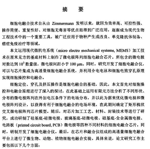 【摘要】:細胞電融合技術自從由Zimmermann發明以來,就因為效率高、可控性強、操作簡便、重復性好、對細胞無毒害等優點而得到廣泛應用,逐漸成為現代生物工程技術中的一個重要工具,被廣泛應用于物種產生或改良、單克隆抗體制備、癌癥免疫治療等領域。本文運用現代微機電系統(micro electro mechanical systems,MEMS)加工技術在厘米見方的基底材料上制作了微電極陣列細胞電融合芯片。所包含的微電極對數達到103數量級,微電極間距小于100μm。同時,研究開發了細胞電融合儀,可以與芯片集成為高通量細胞電融合系統,并利用介電電泳和細胞電致穿孔原理實現細胞操控和電融合。細胞定位、穿孔及擠壓操作是細胞電融合的基礎。因此,本文首先對細胞操控和電融合原理進行了深入的探討,在此基礎上運用有限元方法分析了不同形狀、分布的微電極陣列在外加電壓條件下的電場分布,并以此為據來優化微電極和微電極陣列設計,以獲得有利于細胞電融合的電場環境。在此期間確定了矩形梳狀交叉微電極陣列芯片模型。