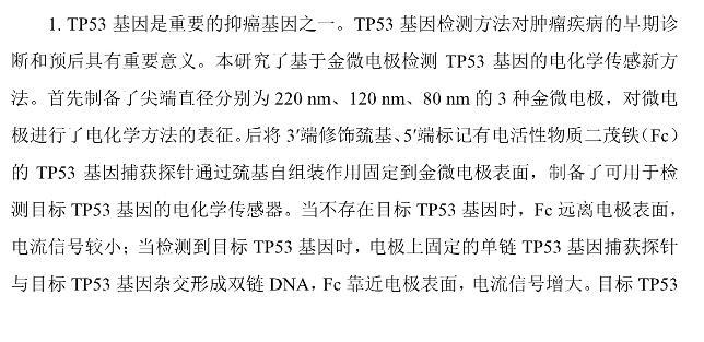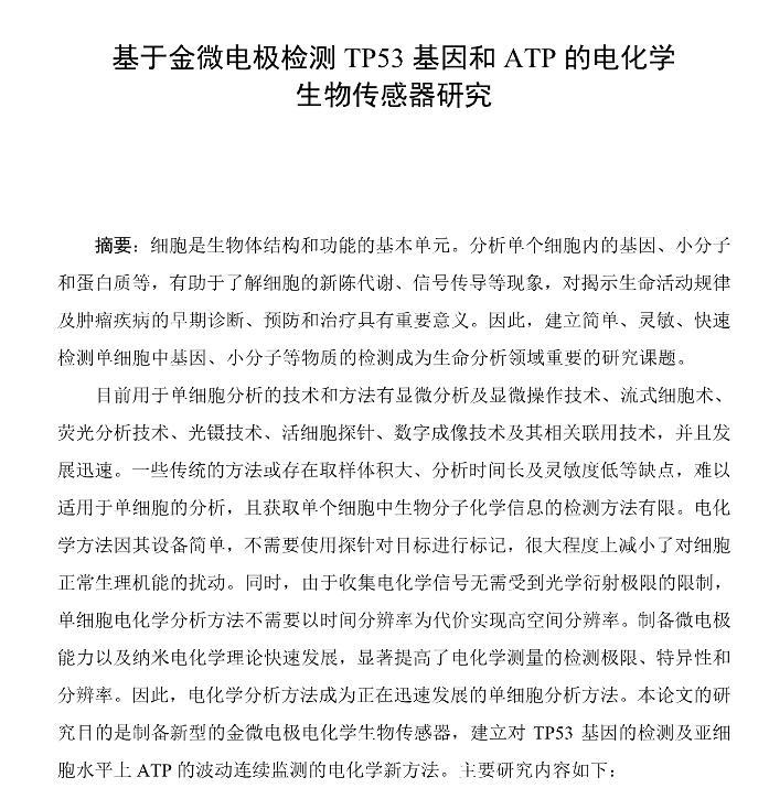 一些傳統的方法或存在取樣體積大、分析時間長及靈敏度低等缺點,難以適用于單細胞的分析,且獲取單個細胞中生物分子化學信息的檢測方法有限。電化學方法因其設備簡單,不需要使用探針對目標進行標記,很大程度上減小了對細胞正常生理機能的擾動。同時,由于收集電化學信號無需受到光學衍射極限的限制,單細胞電化學分析方法不需要以時間分辨率為代價實現高空間分辨率。制備微電極能力以及納米電化學理論快速發展,顯著提高了電化學測量的檢測極限、特異性和分辨率。因此,電化學分析方法成為正在迅速發展的單細胞分析方法。本論文的研究目的是制備新型的金微電極電化學生物傳感器,建立對TP53基因的檢測及亞細胞水平上ATP的波動連續監測的電化學新方法。主要研究內容如下:1.TP53基因是重要的抑癌基因之一。TP53基因檢測方法對腫瘤疾病的早期診斷和預后具有重要意義。