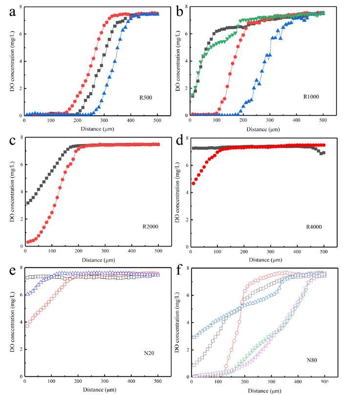 圖5、不同類型的微生物燃料電池內陽極生物膜內溶解氧(DO)濃度的分布。(a)R500,(b)R1000,(c)R2000,(d)R4000,(e)N20,(f)N80陽極生物膜內氧濃度分布的。0μm為石墨陽極表面