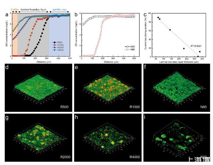 圖3、陽極生物膜中的氧氣分布富含(a)500–4000Ω的外部電路電阻。(b)以20–160 mL/min的氮氣噴射速率富集MFC。0μm代表石墨陽極表面。評估了陽極生物膜內溶解氧(DO)濃度的分布和生物膜結構。使用氧微傳感器測量溶解氧濃度并評估層流邊界層的厚度。(c)曝氣期間陽極電流損失之間的線性關系。(d)R500、(e)R1000、(f)N80、(g)R2000、(h)R4000和(i)N20的3D物理結構圖像。對生物膜進行LIVE/DEAD活力染色并通過CLSM進行觀察。活細胞成像為綠色,而死細胞成像為紅色。數字代表軸的長度。