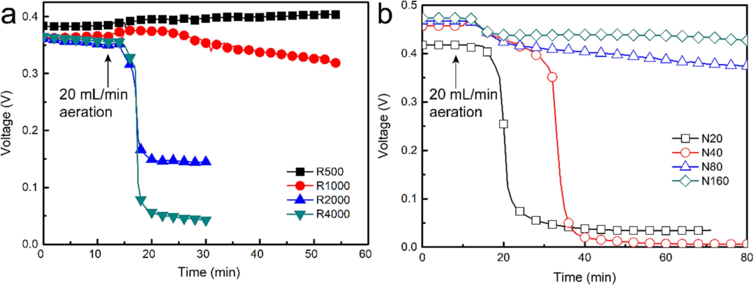 圖1、以20 mL/min的速度直接泵送空氣時,MFC電壓隨時間變化。(a)MFC富含500–4000Ω的外部電路電阻。(b)以20–160 mL/min的氮氣噴射速率富集MFC。黑色箭頭表示以20 mL/min的空氣泵入陽極室的時間。隨著陽極富集過程中氮氣鼓泡速率的增加,電池電壓損失降低。