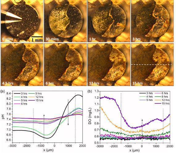 圖3、指定浸泡時(shí)間后HBSS中FeMnAg的視覺外觀和線掃描(a)局部pH值和(b)樣品表面上的DO濃度。白色虛線顯示線掃描的位置。黑色虛線表示樣品位置。在第一張光學(xué)顯微照片中可以看到用于測量的pH和O 2微探針。從圖中可以看出FeMnAg表面上明顯的酸化和堿化位點(diǎn)反映在與光學(xué)圖像中腐蝕外觀相關(guān)的pH線掃描上。隨著浸泡時(shí)間的增加,由于腐蝕產(chǎn)物的大量覆蓋,酸化和堿化作用逐漸減弱,同時(shí)阻礙了氧的擴(kuò)散,強(qiáng)耗氧量逐漸減少。