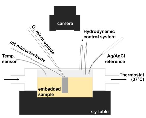 使用unisnese pH微電極和DO微光極位于樣品表面上方50μm處。其中玻璃型pH微電極(unisense)測量局部pH,其尖端長度為50μm,尖端直徑為10μm。Ag/AgCl電極適合作為外部參比電極。使用顯微操作器控制pH微電極和DO微光極之間的距離,并使用定制的雙頭級顯微操作器在水平面上保持50μm,允許原位同時(shí)監(jiān)測pH值和DO濃度的演變。