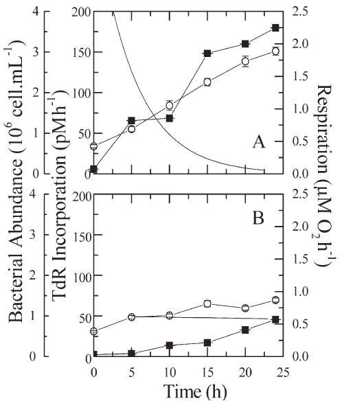圖3、兩種營養環境下(富營養化的水體和缺乏營養的水體)培養的細菌樣本中的細菌豐度(○)、TdR(■)結合率和呼吸速率(-),所以水體樣本都經過0.6um微濾膜過濾。