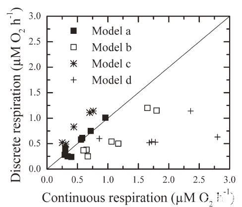 圖5、不同測量O2獲得細菌的呼吸速率的方法對比(離散呼吸法和連續呼吸法)。離散方法是根據培養開始和結束時氧濃度的差異計算出細菌相應的呼吸速率值。