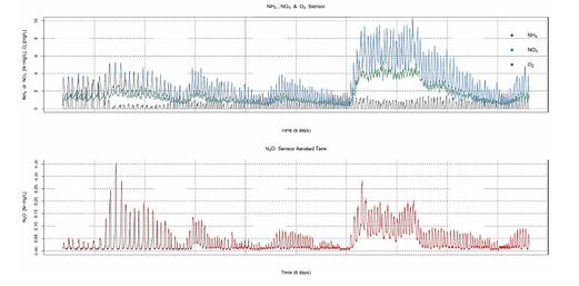 ![]() NH4+、NO3- 、O2 和N2O數(shù)據(jù)系列圖(14天測量周期中的一個6天區(qū)段),包括低氧設定值和兩個高負荷期中的一個。 |